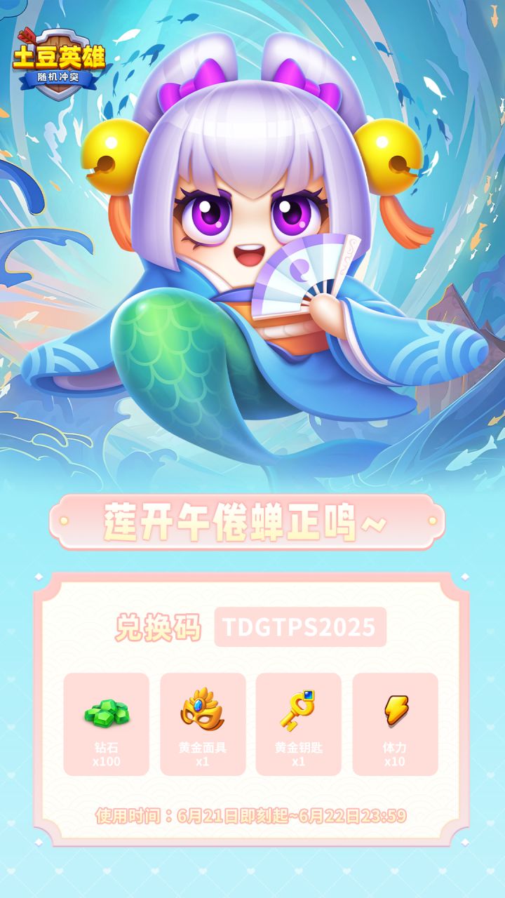 夏至将至,太阳公公今天加班最久,快把土豆里的史莱姆都晒化掉~记得边吃冰镇西瓜边打大秘境(๑•̀ㅂ•́)و✧ 祝各位召唤师刷塔爆红装、匹配连胜,连蚊子都追不上你的灵活走位!【特别兑换码】TDGTPS2025 (土豆瓜甜蒲扇2025) 【礼包】钻石*100+黄金面具*1+黄金钥匙*1+体力*10【有效期】6月21日即刻起 - 6月22日23:59