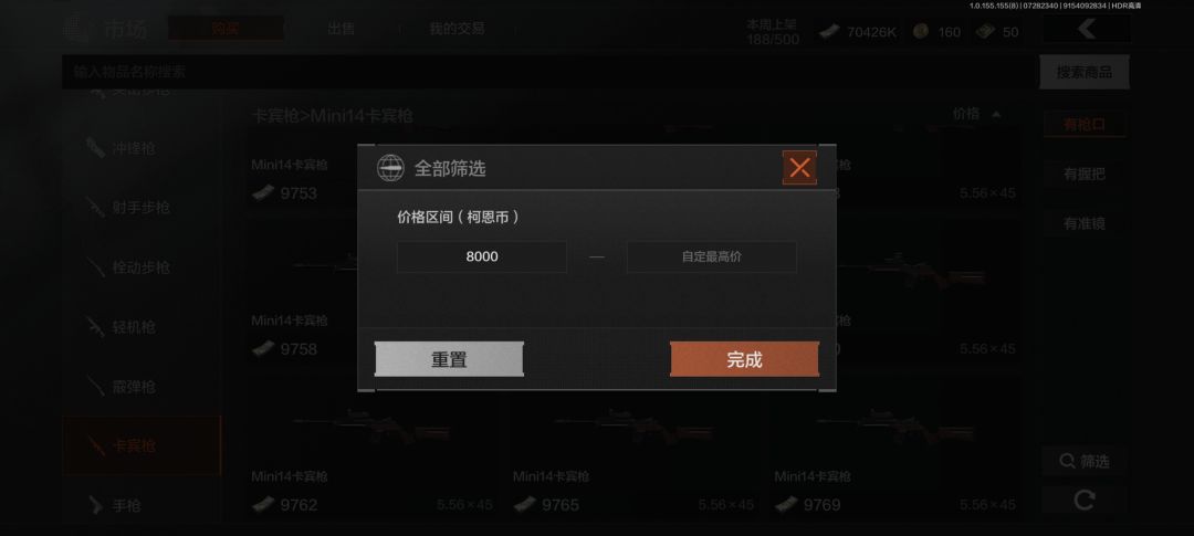武器选择mini卡宾枪,筛选有枪口,筛选8000以上,然后划拉划拉看看,有消音的就可以买了。可以把配件拆了给其他枪