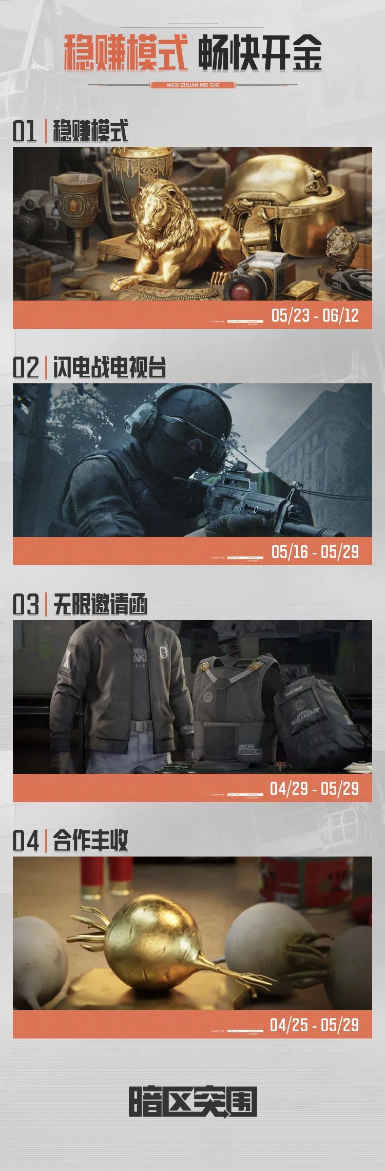 活动倒计时提醒!还没参与的先锋抓紧时间,福利好礼别错过! 稳赚模式 活动时间 2025年5月23日-2025年6月12日 活动规则 活动期间开放【稳赚模式】入口,三张稳赚模式地图轮流开启。消耗物资积分即可选择多档配置丰富的专属套装,进入稳赚模式的战斗。 奖励结算 战斗结算时会根据当时先锋身上所有物资的价值,折算为对应的物资积分。即使撤离失败,也能够获得一定比例的积分。 特殊奖励 稳赚模式中,如果