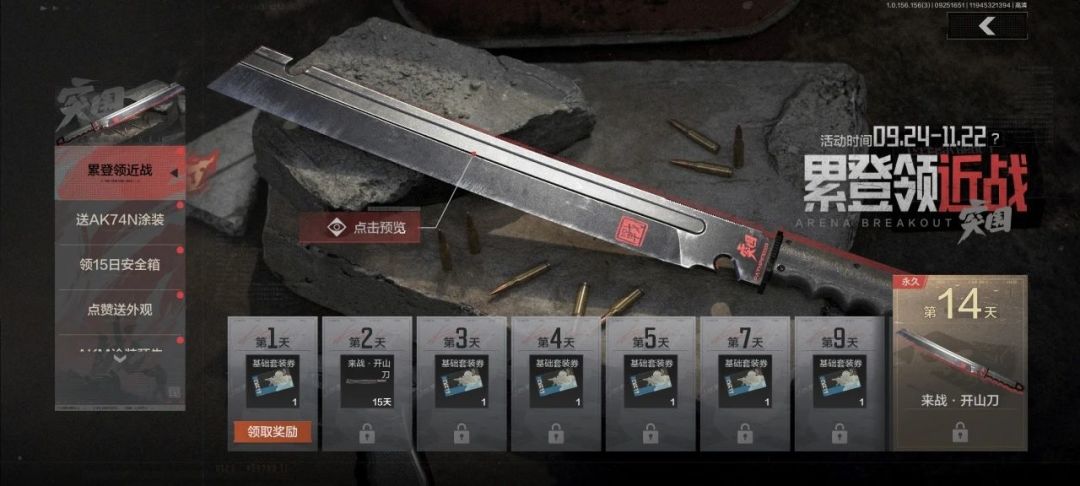 暗区突围开启史上最大力度福利活动,全新近战武器、枪械涂装、纪念外观、安全箱...全部免费送!还在迷惑不知如何入手豪礼?速来跟着老皮薅福利,这个秋天一起来上暗! 累登领近战武器 来战·开山 刀免费送!9月24日~11月22日期间,参与每日登录活动,即可领取近战武器和基础套装券,若先锋们昨天已经登录过,今天便可以解锁来战·开山 刀15天体验卡,累积登录14天就能将【来战·开山 刀】(永久)收入囊中! 积