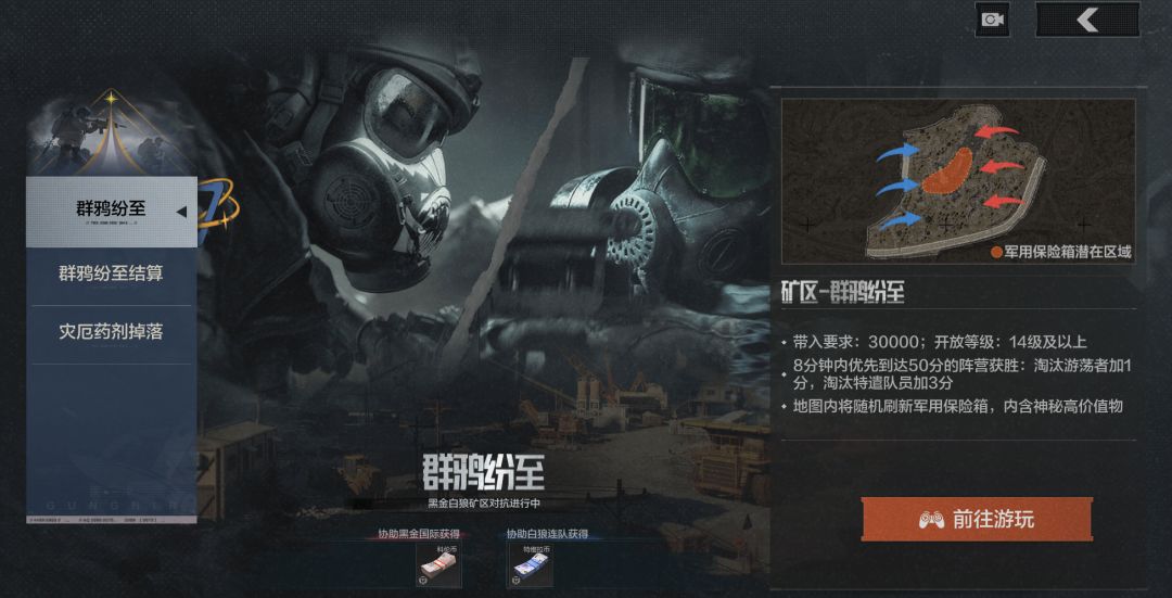 先锋们,老皮有新的暗区情报送达: 飞机坠毁地点的调查人员传回消息,在坠机处的货物残骸中,发现了一些引人注目的特殊试剂。在确认了 试剂的污染性质与特殊功用之后,科伦与特维拉立刻派遣前线人员,一场大战于矿区一触即发...... 群鸦纷至,引燃矿区!矿区势力对抗开启,黑金与白狼小队再次展开对决,选择你的合作阵营,参与这场争端! 四处散落的灾厄药剂使用后将会带来加强效果,但也会有严重副作用,先锋捡到后需要