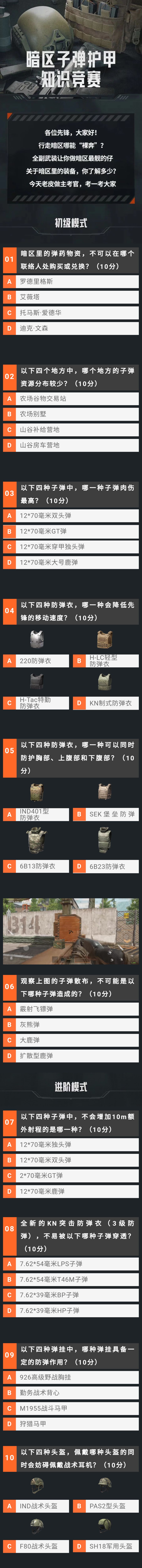 以上所有题目,每题10分,先锋们看看自己处于哪个段位? ❖ 50分及以下点这里 ❖ 暗区装备新手:这位先锋不拘一格,莫非就是传说中的“刀仔”?不追求华丽装备,坚持经济简约,一刀在手,天下我有!总之,动作要快,姿势要帅,装备什么的局内捡一捡就好啦~ ❖ 60-80分点这里 ❖ 暗区装备新秀:这位先锋见多识广,在装备方面量入为出,不追求贵重装备,适合自己的才是最好的,对装备的了解已初出茅庐,老皮建议,