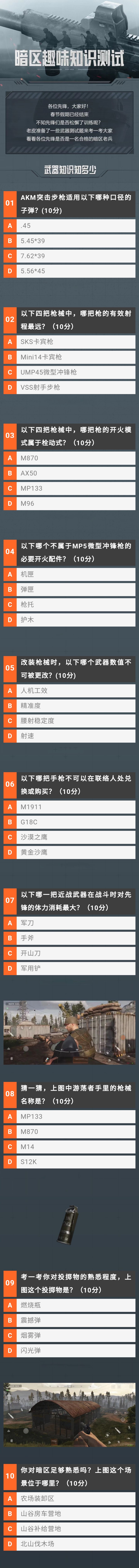 以上所有题目一题10分,各位先锋可以根据自己的得分情况看下自己属于哪个段位。 ❖ 60分以下看这里 ❖ 暗区新兵:这位先锋不要气馁,敢于闯荡暗区就已经很棒了!也许你只是刚进入暗区不久,对暗区武器知识了解较少,建议平时多跟着资深先锋学习,老皮也会持续更新攻略给大家,相信假以时日你一定能变成暗区大佬! ❖ 60-80分看这里 ❖ 暗区新锐:恭喜这位先锋,越来越熟悉暗区,成绩虽然不能代表什么,但至少证明