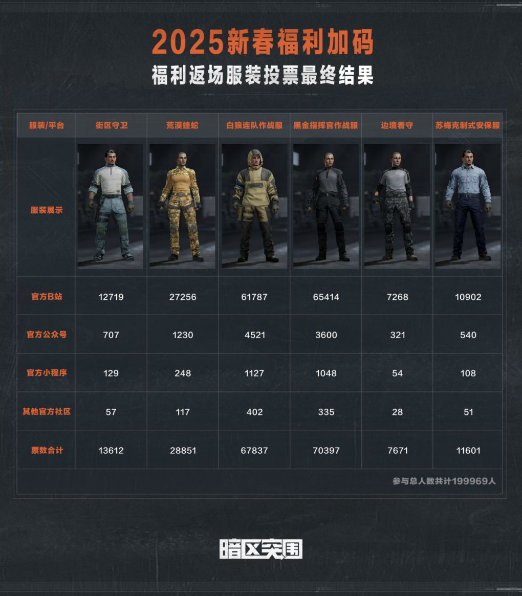 亲爱的暗区先锋: 应广大先锋呼声,新春福利再加码!上周官方社区开启了福利服装返场投票活动,目前投票时间已截止,累计199969位先锋参与投票,黑金指挥官作战服以总投票70397的优势获得胜利,将在1月22日通过营房暖冬-返场外观活动进行福利返场!(详细投票结果可查看本条公告最后活动备注。) 同时我们也看到部分先锋反馈已有黑金指挥官作战服,因此本次返场活动将提供10枚盲盒赠币选项,无需黑金指挥官