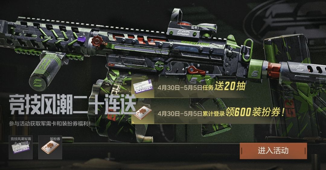 活动倒计时提醒!还没参与的先锋抓紧时间,福利好礼别错过! 【竞技风潮二十连送】活动完成任务即可获得竞技风潮20连抽,登录还有装扮券可领取! 【重装行动-安全区】装备价值限制提升,摸金更爽快! 【特遣归队 收入翻倍】最高可额外获得价值150万柯恩币奖励! 活动玩法+关键奖励老皮已为大家整理好,赶紧一起来看看吧! 竞技风潮二十连送 活动时间 2025年4月30日-5月5日 活动规则 <对局得十连> 活
