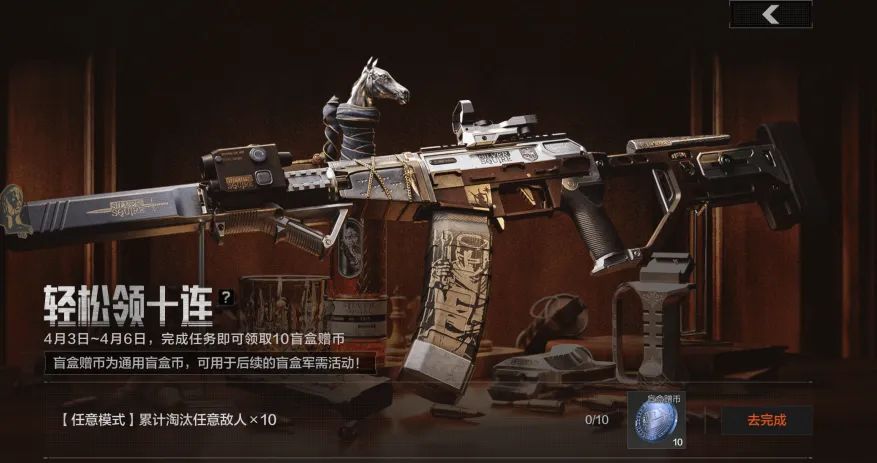 暗区春日大放送,二十连抽免费领!4月3日至4月6日,完成任务即可领取10枚盲盒赠币!;4月3日至4月17日,绑定暗区老兵或新兵组队开局,即可再领10枚盲盒赠币! 盲盒赠币可用于抽取骑士之剑主题军需,斩获全新枪械涂装!立即上暗,和老皮一起薅福利! 轻松领十连 活动时间 2025年4月3日-2025年4月6日 活动规则 在活动期间内,累计淘汰共10名敌人,即可领取10枚盲盒赠币! (盲盒赠币为通用盲盒