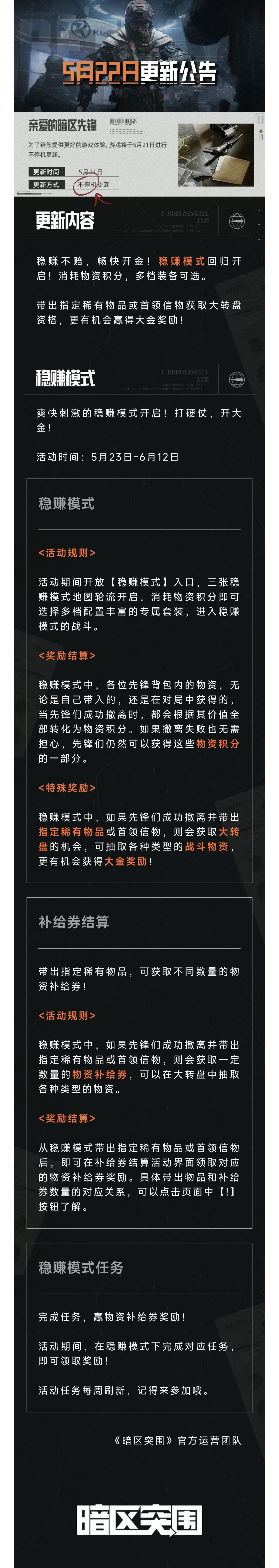 农场大金争夺开启,空投必出大金!新玩法遗物寻回上线,调查战局信息,换取柯恩币报酬! 空投大金等待先锋们猛攻,快和老皮一起上暗突围吧! 遗物巡回 活动时间 2025年4月30日-2025年5月15日 活动说明 连年的战乱,失踪的亲友,逐利的新人,遗物巡回计划就制定于这样糜烂的暗区之中。为了能够找到自己心中的那个人,有的人拒不放弃,有的人高价悬赏,让他们打消念头的方式只有一个,就是为他们呈现斯人已逝这