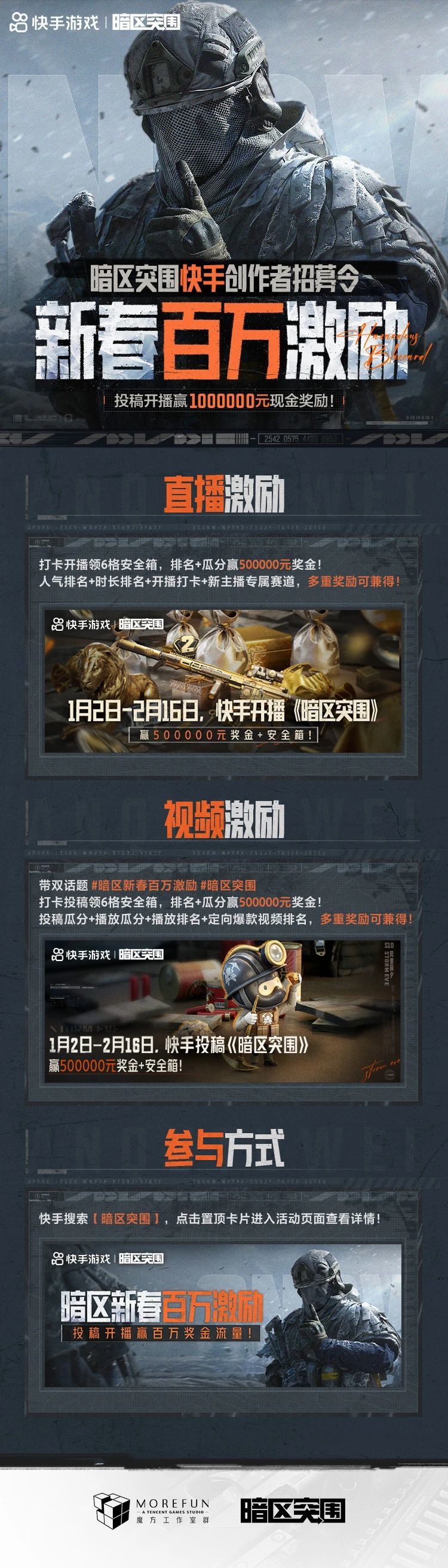 暗区突围新春创作激励计划现已开启,感兴趣的创作者们抓紧时间参与到活动中,现参与即可瓜分新春百万激励奖金,轻松赢取安全箱权益,诚邀各路创作者们一起来暗区猛攻! 新春投稿活动 1月1日-2月16日,带话题#暗区新春百万激励#暗区突围,在快手投稿《暗区突围》相关内容,即可同时参与七大奖池(奖励可兼得),50万元现金大奖等你瓜分,优质稿件还可获流量扶持! 新春直播活动 1月1日-2月16日,开播《暗区