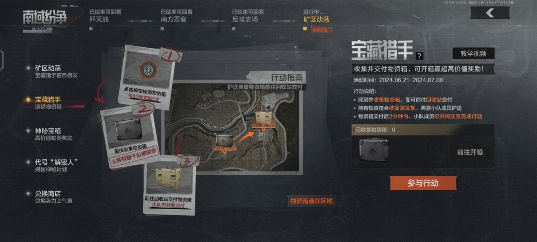 新出了宝藏猎手和神秘宝箱活动,宝藏猎人活动在矿区地图进行,游戏地图直接选择宝藏猎人就可以进入该模式,核心玩法就是抢物资箱去提交就可以完成任务,但是我打了3把一把都没抢到,要么是刷太远了,要么就是一过去就好几队人太难抢了,我一定会再回来的。 神秘宝箱活动就是宝藏猎人抢到物资箱之后的福利活动,抢到物资箱之后就可以获得箱子,进行登录与进行游戏就可以获得钥匙,钥匙箱子加2000科恩币就能进行抽奖,有两个大