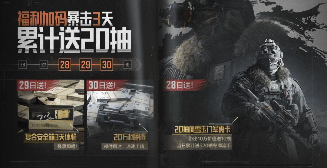 亲爱的暗区先锋: 为了答谢所有暗区先锋这一年对暗区突围的支持和关注,我们决定,对年度战术套装风雪玉门,额外加赠10抽军需卡,累计可免费获得20抽! 同时为了让各位先锋在春节有更好的游戏体验,福利再再再加码!1月28日-1月30日连续登录,除风雪玉门20抽军需卡,还可获得复合安全箱权益卡(3天)、20万柯恩币!获取方式如下: 1月28日送20抽: 活动一:登录暗区,累计带出价值10万的物资即可免费获