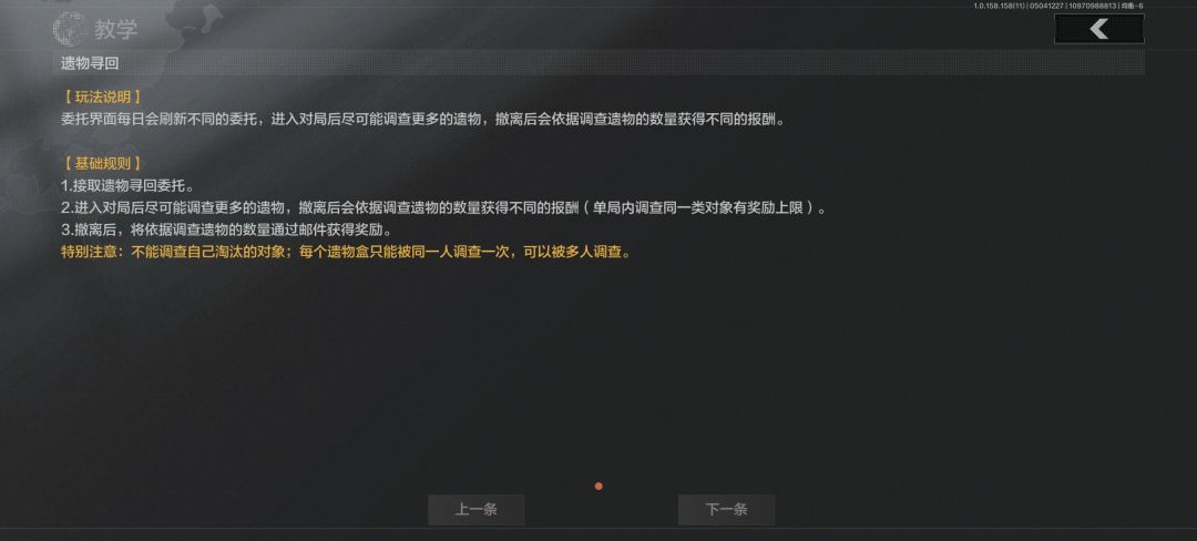 活动规则 - 委托任务:先锋每日有一次选择委托的机会,扮演游荡者潜入战局,可进入普通模式或封锁区模式。选定委托后获基础装备,不满意可花柯恩币刷新,难度越高报酬越丰厚。 - 寻找遗物:进入战局后,使用配发的信号追踪器追踪信号方向找遗物箱。调查遗物后,根据遗物原本主人的身份获得不同的调查记录,携带调查记录撤离可结算获得柯恩币奖励。每种记录转换次数有上限,非遗物寻回专员获得的调查记录无法转换为柯