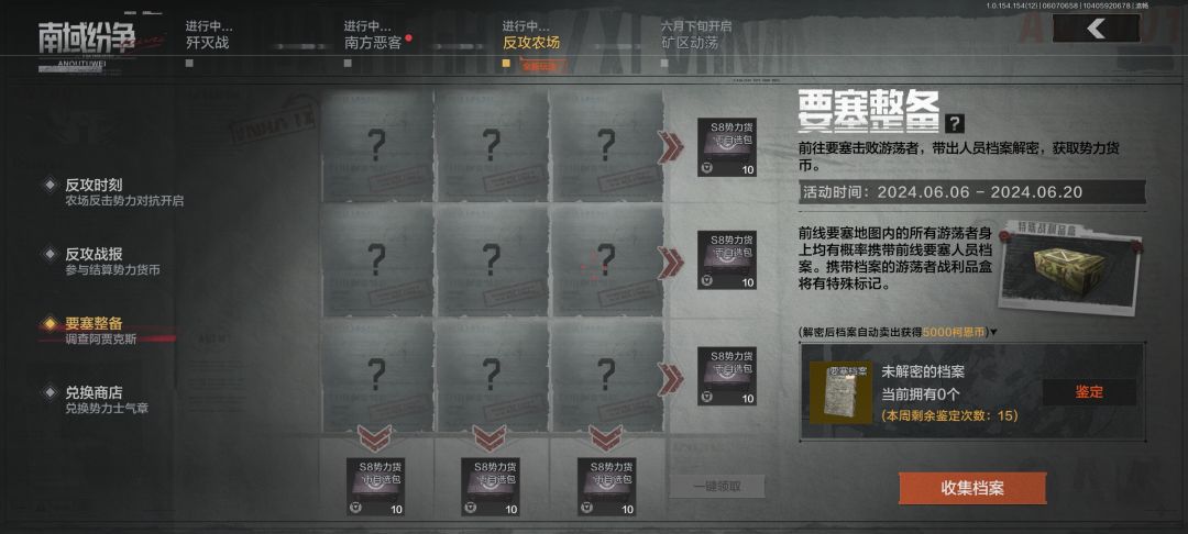 本次出本子出来两个新的可以获得势力币的活动。分别是“要塞整备”和“农场反击战” “要塞整备”在要塞内击杀特殊的人机就可以获得他背包内的一个物品。未解密的文件。将他带出后即可在活动页面鉴别一下。这是一个九宫格,只要九宫格内三三相连就可以获得的实力币礼盒。 “农场反击战”这个活动很出过很多次。这个就是一个换皮肤的活动。双方选择一个实力方的人数获得相应的分数即可获得胜利。这个活动出现过很多次,和之前的活