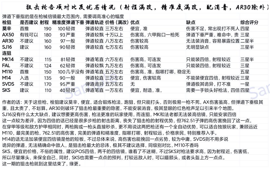继上期步枪属性解析及建议后,今天又出现了狙击枪解析及建议,话不多说,先上图。 在这里主要来讲一下狙击枪适用子弹及地图,首先,除去AX50,AR30,SJ16,SKS以外,其他枪我建议,普通模式三级弹,封锁区三到四级弹,前线要塞,电视台,四级到六级弹,在这个基础上,子弹选择就根据个人实力来了,有钱普通图也可以六级弹,没钱高级图可不能三级弹。 为什么呢,一是价格,二是危险系数,拿电视台举例,人机起步