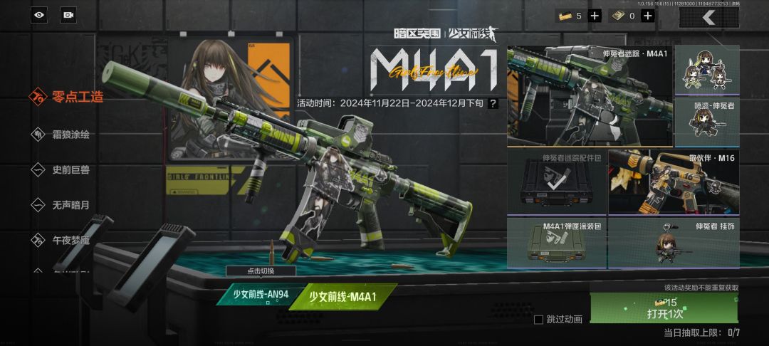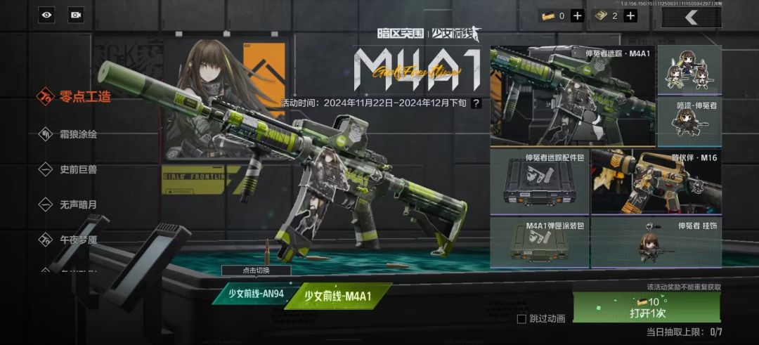 本次的“蚀刻中心”以及“零点工造”两个活动,堪称史上最良心军需!蚀刻中心可以抽出ak12以及416的皮肤,白送总共六十抽也可以拿打底四个紫皮和两个金皮(镜子也算金皮,嗯),而零点工造则是an94,rpk,小公主,16鸽的皮肤,416的皮肤肝满再补点钱就可以换,超级好看!同时,本次活动!基本上可以白嫖一半!虽然说难度会比较高,但是不得不说本次的奖励真的可谓丰富了,每一个金皮检视都搭配了一个q版小人,