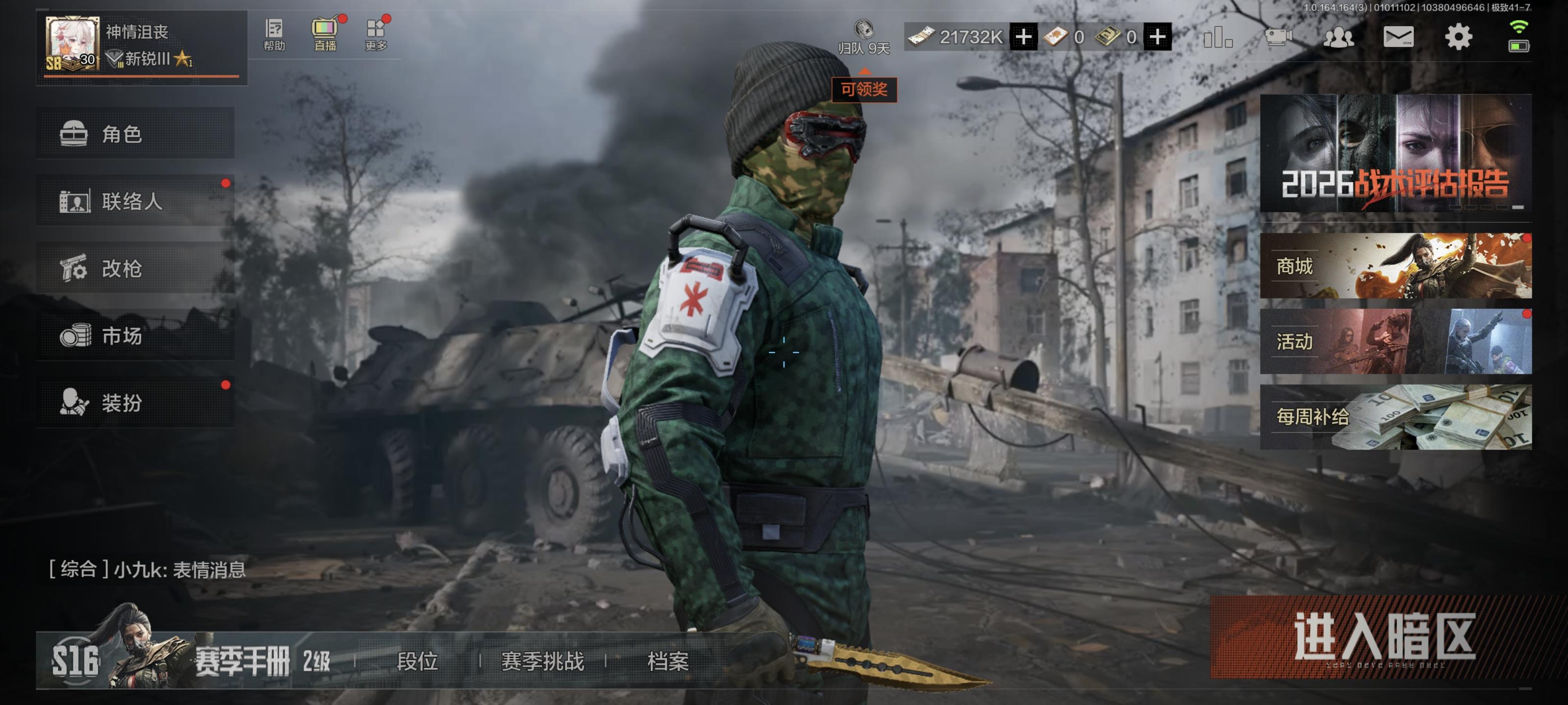 先锋,2026年新年快乐!暗区出金不难,撤离不难,上手不难!暗区突围手游S16赛季现已上线,1月1日登录即领限定涂装,最高送一年2x3安全箱!2026,搜打撤上暗区就够了!1月1日登录就送6格,最高可开出365天六格安全箱!1月1日-1月3日,登录就送动感舞步·ACE31!· 1月1日-1月29日,完成每周任务获得积分,至多可领取1800赛季装扮券!· 1月1日-1月15日,集结上暗