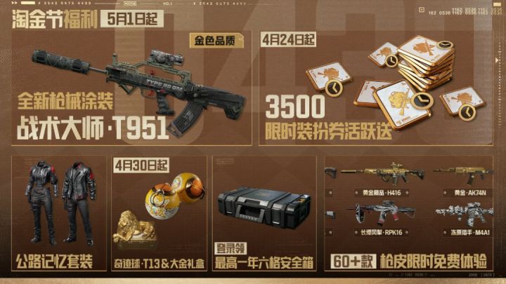 上暗淘金节4月30日正式开启!狂热淘金季,上暗领海量福利!金品枪械涂装、限定外观、主题套装全部免费获取,累计3500限时装扮券狂送不止!更有六格安全箱、多重主题军需卡等你来领!淘金节活动及福利也已全都汇总好!福利已就位,只等你上暗!战术大师首款免费金色品质枪械涂装!完成活跃任务金色品质【战术大师·T951】免费带走!活动期间,完成每周宝箱挑战,积累进度即可免费获得【战术大师·T951】金色品