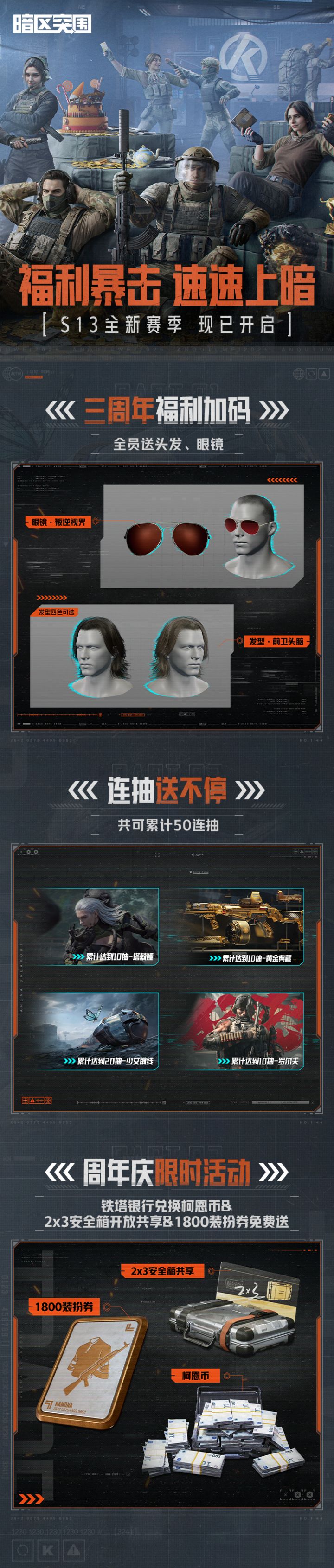 先锋们,S13赛季开启在即,我们在新赛季的局内系统和地图上再次做出优化,增加了方便先锋们获取信息、快速应战的功能,电视台地图迎来重大更新,更有大家期待已久的歼灭枪械涂装功能、训练场扩建等内容等你来发现!