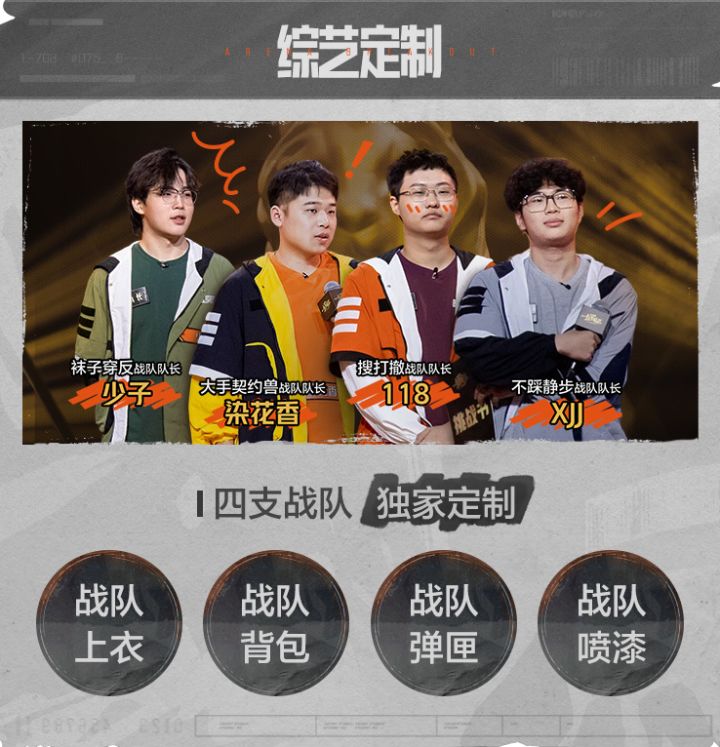 首套综艺主题套装上线换新衣过新年新年之际,正是万象更新之时,《暗区突围》也为大家准备了一份特别的惊喜 —— 首套综艺主题套装正式开售!套装中包含四大战队同款定制的上衣、背包、弹匣、喷漆4件道具。事不宜迟,现在就和老皮一同来领略这套套装的上身风采,感受其独特魅力~售卖时间本次道具套装为游戏外独家限定,游戏内不会上架,且购买机会非常难得,只有在本次活动期间才能将它们收入囊中,各位先锋若看中了