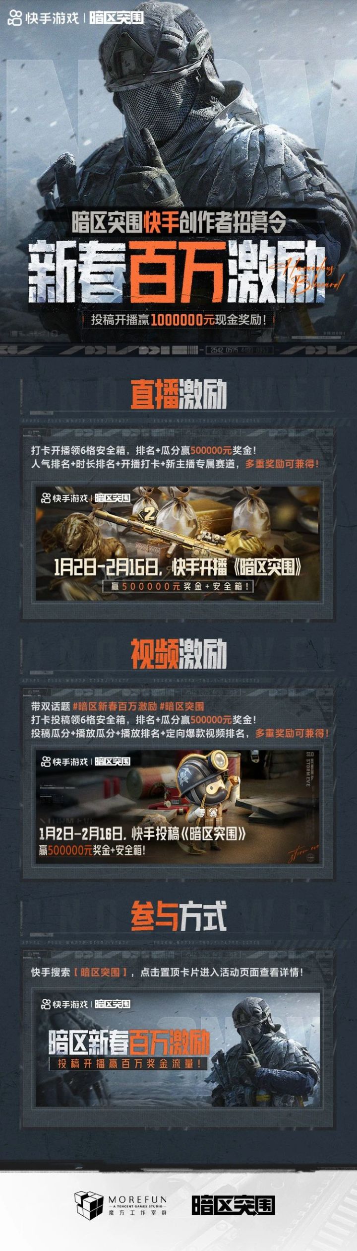 暗区突围新春创作激励计划现已开启,感兴趣的创作者们抓紧时间参与到活动中,现参与即可瓜分新春百万激励奖金,轻松赢取安全箱权益,诚邀各路创作者们一起来暗区猛攻! 新春投稿活动1月1日-2月16日,带话题#暗区新春百万激励#暗区突围,在快手投稿《暗区突围》相关内容,即可同时参与七大奖池(奖励可兼得),50万元现金大奖等你瓜分,优质稿件还可获流量扶持! 新春直播活动1月1日-2月16日,开播《暗区