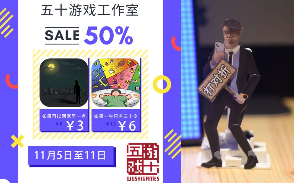 Hi,各位周五好,我的舅舅是魔法师上午10点已经正式上线。如早 如三11月5日至11日 对折优惠下一个游戏项目页面也开启了,会尽快上线测试。另外我们工作室在 B 站已经开设账号,更新频率正常情况下是周更,欢迎关注。或者搜索账号:五十游戏工作室祝各位小伙伴周末愉快!