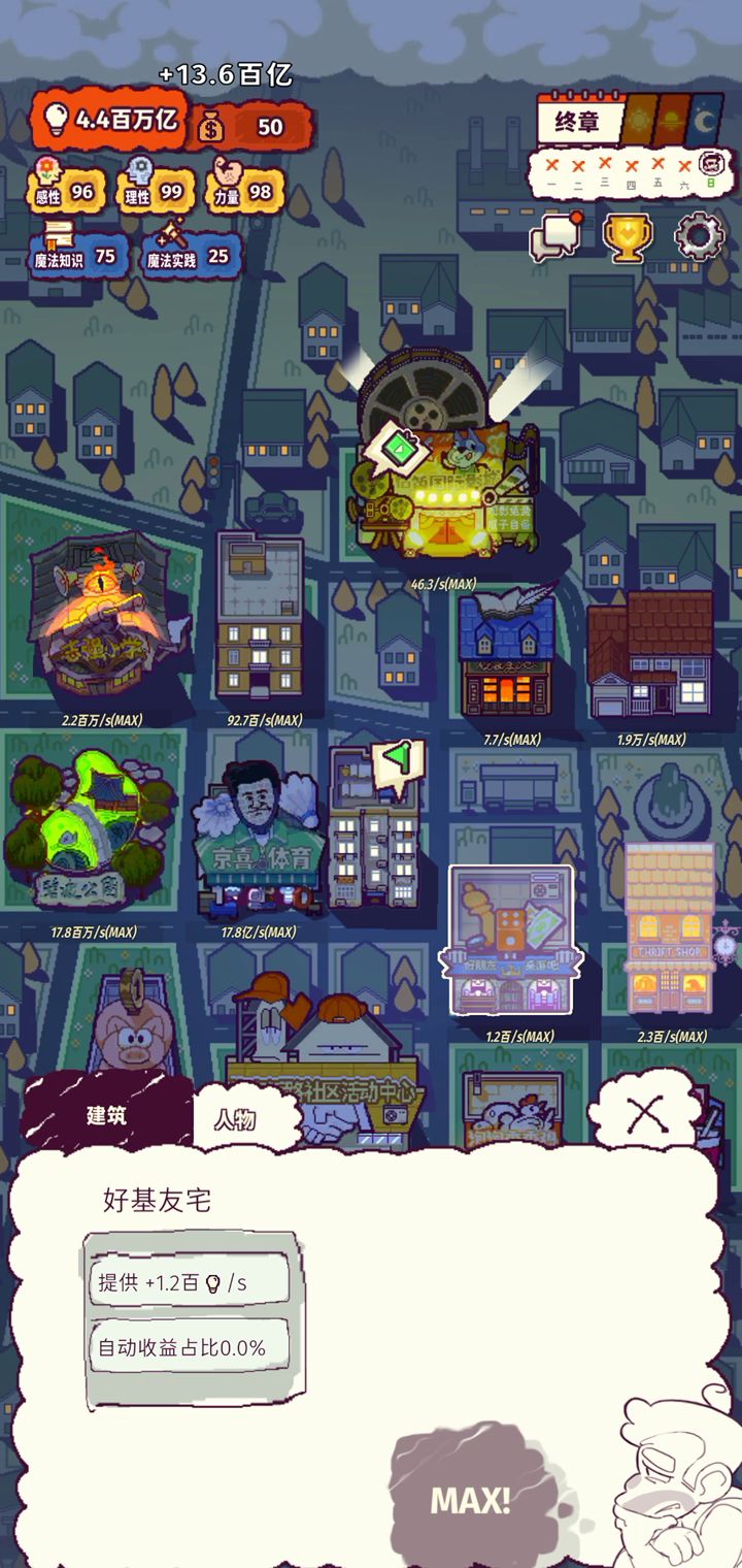 我好像!有点懂了!! quq前女友和卓拉的好感度为0quq莫得感情 好感度最高的是姐姐quq 弟弟的好感度咳咳 好基友好感度也可以quq 觉得就适合早上开一下然后看个广告升个级,然后晚上睡觉前再打开在看个视频升个级什么的,确实保住了我的肝ovo而且!挂机赚钱好像没有上限!好耶! 而且感觉玩法很有意思ovo画风也超棒!