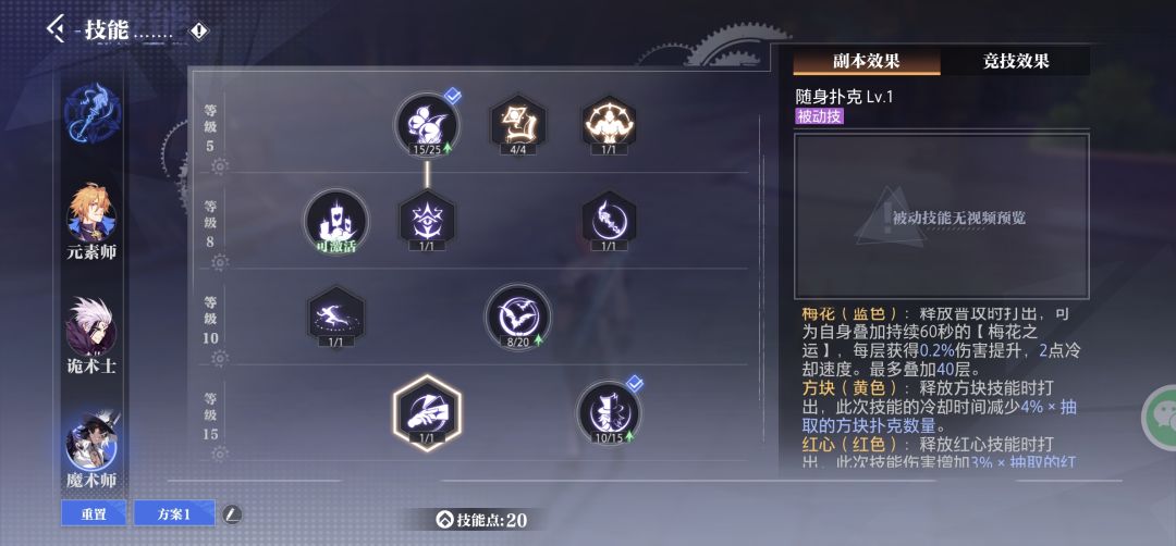 魔术师被动共有四种, 梅花:普攻触发,叠加伤害和冷却 方块技能:根据方块数量减少冷却 红心技能:根据红心数量增加伤害 黑桃技能(觉醒技):根据梅花、方块、红心数量减少冷却和增加伤害 根据机制推出红心流打法: 方块技能选冷却快的小技能;红心技能选冷却稍长的大技能。打的时候先用普攻和方块技能,等被动全是红心的时候再用红心技能