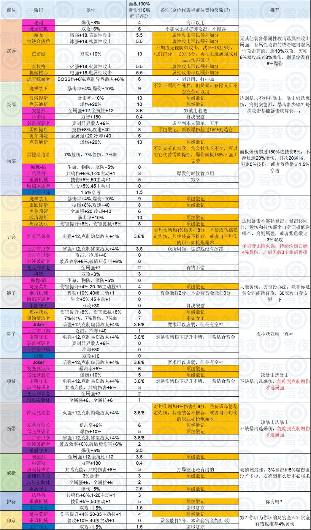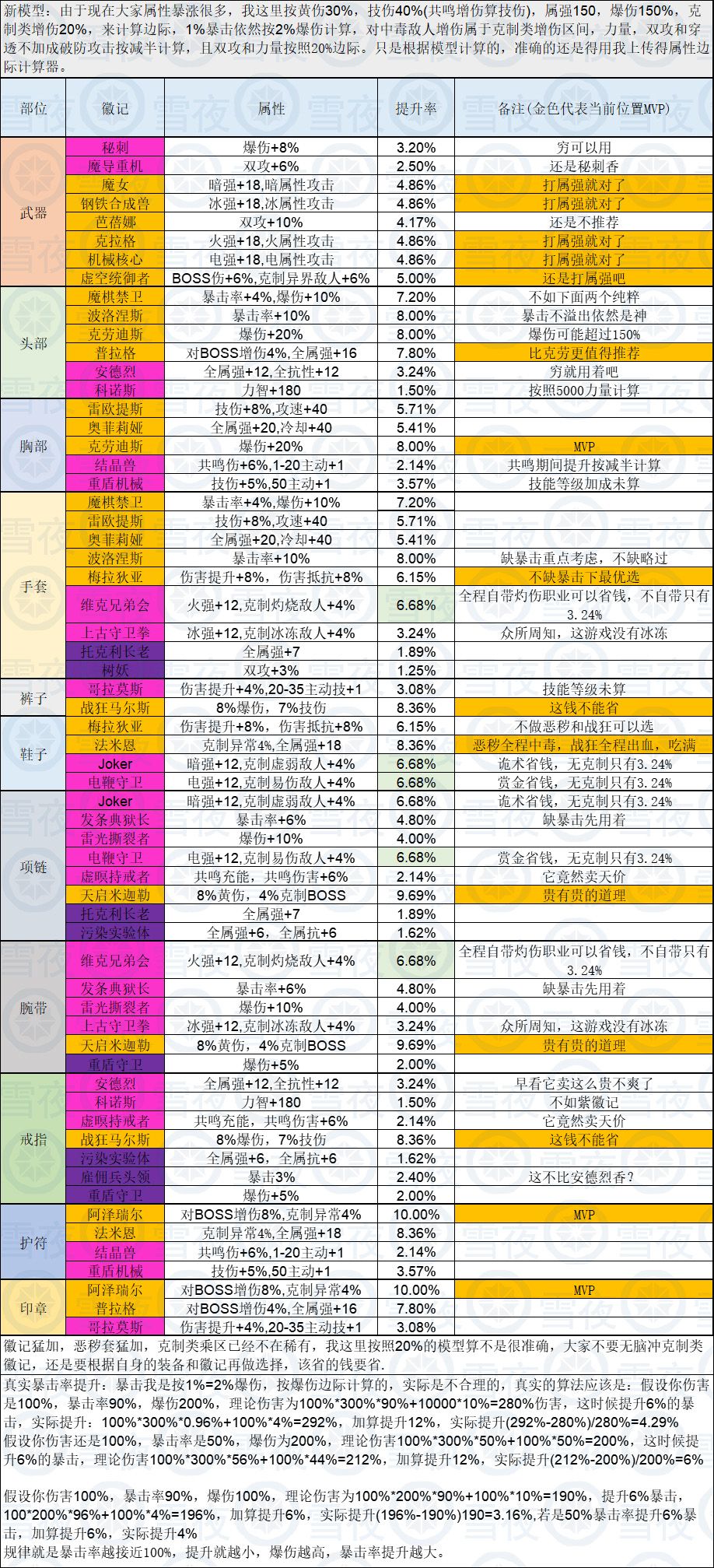 2023年9月8日,更新了黑蚀缔造者徽记,这个徽记最大的意义是,别的职业打不起克劳都可以打雷欧提斯,赏金只能选超贵的克劳,有了这个徽记,多了一个不错的选择,对其他职业意义不大,或者鞋子部位嫌弃女王徽记太贵了,也能用这个给自己的钱包减负。 戒指部位,安德烈这个辣鸡徽记涨价太多了,暴击不溢出的话推荐用紫色暴击徽记代替。 如图 这里我先解释暴击问题,这游戏没有隐藏暴击,但是敏捷和精神会加暴击,随着装备等
