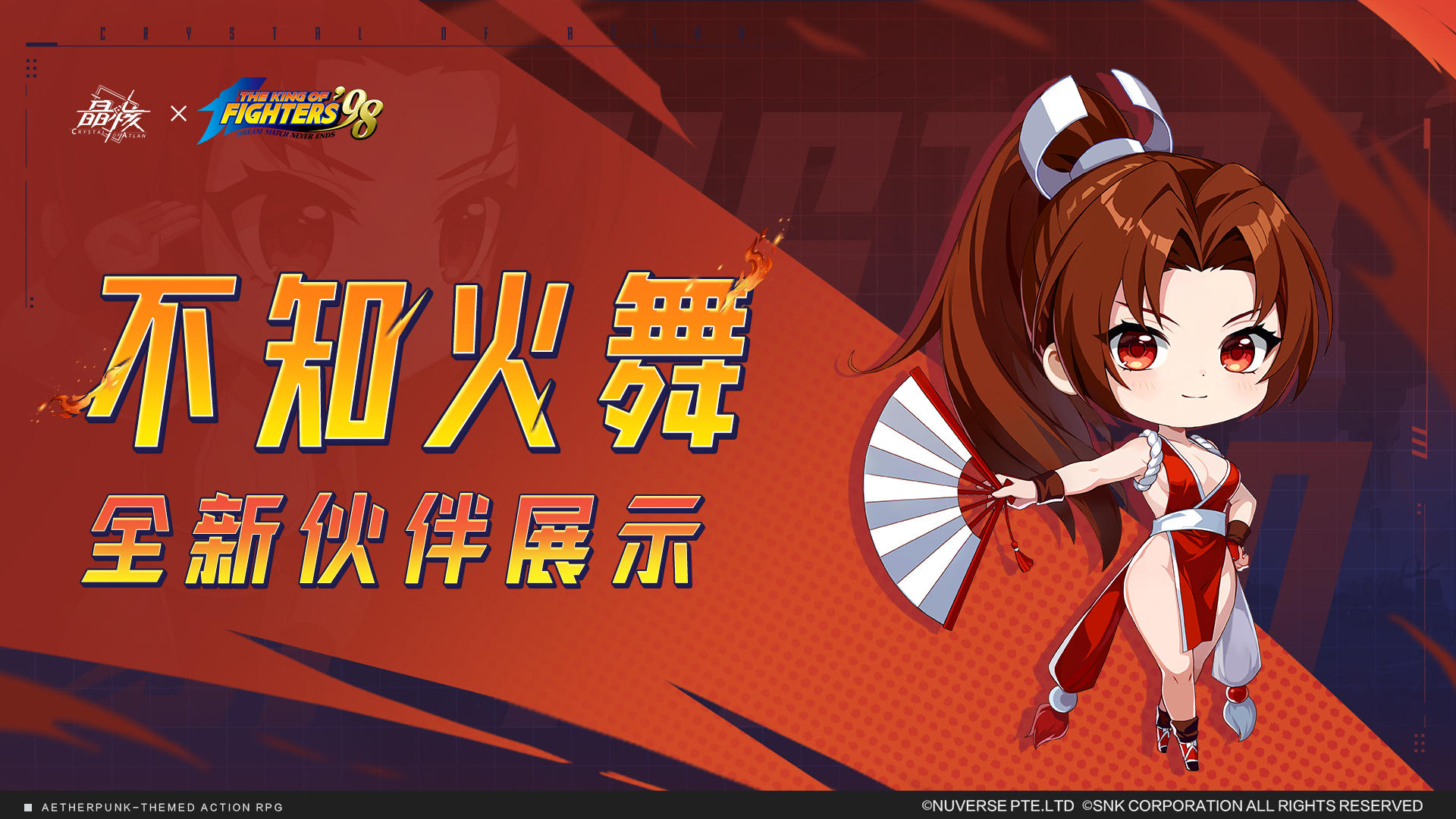 《晶核》×SNK联动伙伴「不知火舞」即将在11月5日登场!她将以萌系形态时刻伴随在冒险者身边~无论探索冒险或是挑战强敌,「不知火舞」都将成为你最亮眼的战斗搭档!重磅联动福利即将登场!参与活动可获得100个「不知火舞圣物箱」,更有SS级联动称号「与火共舞」、SS级联动光环「绯焰之环」、SS级联动配饰「花蝶扇」、联动专属头像框免费获取,多重豪礼千万别错过!燃烧,反叛之音!格斗家新转职「音爆」1