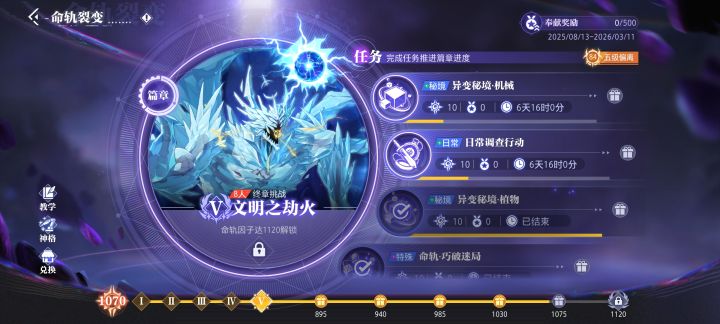 养神格要打命轨,打命轨要养神格日常调查行动已经按要求用粉色魔晶破盾了,小怪不掉血,我那个区域没有蓝色魔晶,我找了一圈,小怪A我一下我噶了,下面的奖励要有贡献点才能领,异变秘境显示没有次数,调查任务过不去,所以领不了,那这神格咋养啊