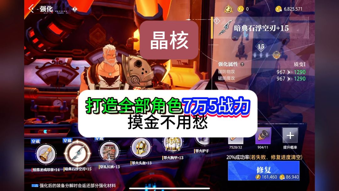 晶核强化全部角色上7万5战力,80版本太轻松了吧,以后摸金不用愁