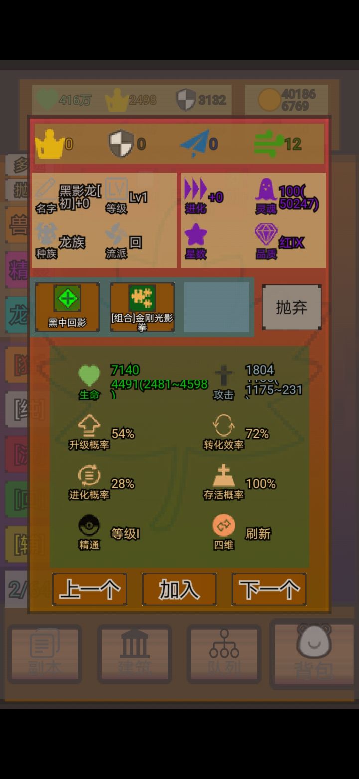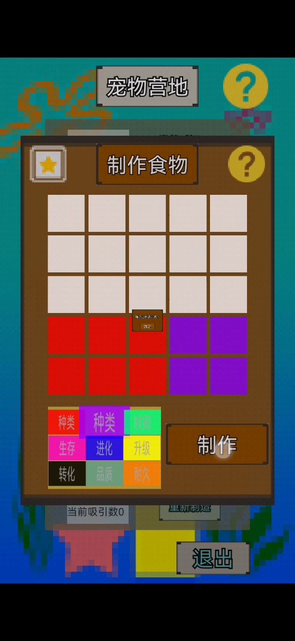 1.开始游戏以后,先制造宠物:建筑——宠物——制造。右上角有说明,我是各种族4个,然后7品质7转化率,剩下的感觉随便。因为品质影响宠物强度,转化率影响宠物进化后强度。剩下的什么进化概率之类的,相对来说爬塔全看运气,反正塔无限,而升级进化却有限。制造完成后需要等一段时间,等到当前吸引数不为0后,点击吸引数,就灰色那块,就能把宠物弄进背包。2.队列下掉全部宠物,背包选择宠物上阵,优先选攻击
