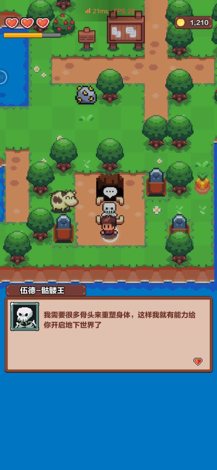 建议还没玩的铁汁不要下载玩!!!建议还没玩的铁汁不要下载玩!!!!建议还没玩的铁汁不要下载玩!!!!!根据我玩过的不少游戏的经验,这游戏肯定是还没有完成就发出来了.不然***地下又下不去,只能种菜收鸡蛋挤牛奶和打小骷髅怪还玩个屁!(骷髅王和我说要搜集骨头,我都***收集300多个了还不能,然后点他他就说别的话不再说收集骨头的事儿)图1接下来我来说说我对这个游戏之后的猜测,如果没有猜错:这