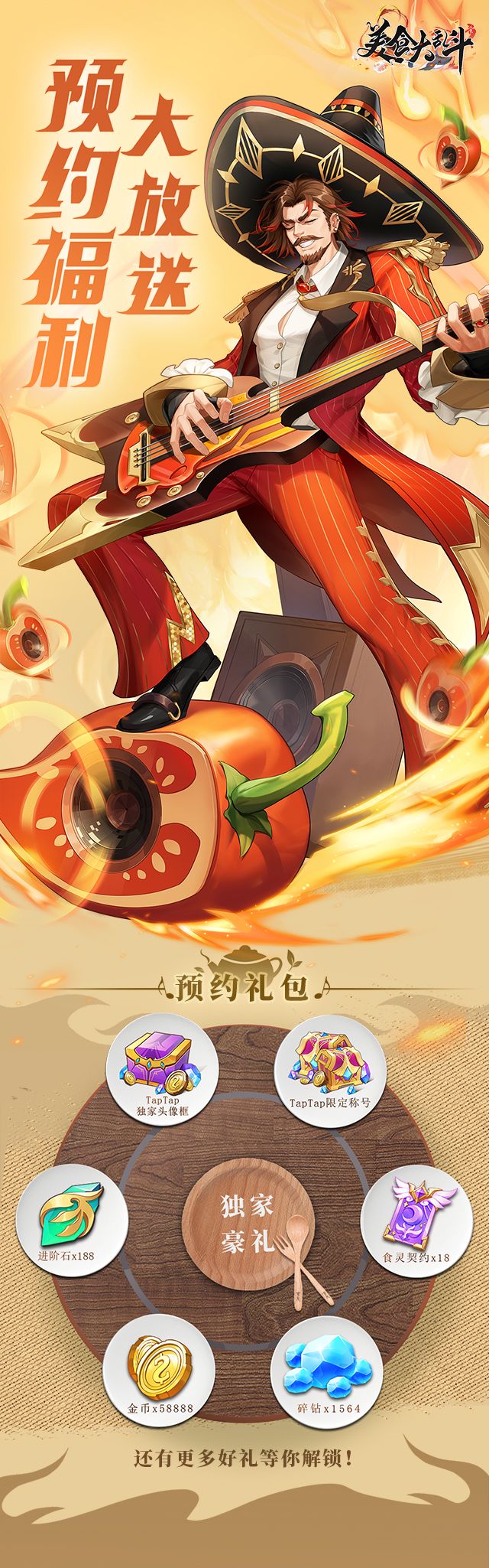 亲爱的美食家们: 《美食大乱斗》登陆TapTap以来,受到很多美食家们的喜爱和关注,为了感谢大家对我们的喜欢,今天我们上线了TapTap专属预约里程碑奖励!!! 本次预约里程碑设置为3个阶段,分别为2万、5万、10万次预约给予的奖励。 2万:食灵契约*3、碎钻*288、金币*58888、进阶石*188 5万:TapTap独家头像框、食灵契约*5、碎钻*388、资格赛挑战券*10 10万:TapTa