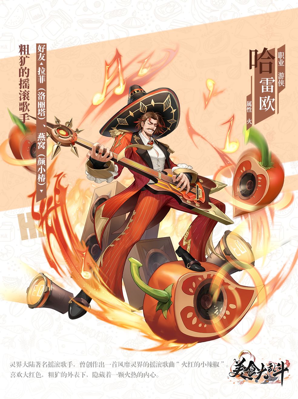 名字:哈雷欧 食物原型:墨西哥辣椒 属性:火 职业:游侠 ———————————————— 性格:热情似火 设定:粗犷的摇滚歌手 好友:拉菲(洛丽塔)、燕窝(颜小椿) ———————————————— 【背景】 灵界大陆的著名摇滚歌手,曾创作出一首风靡灵界的摇滚歌曲“火红的小辣椒”。喜欢大红色,粗犷的外表下,隐藏着一颗火热的内心。 欲知悉更多精彩内容,可点击下方链接加入《美食大乱斗》官方Q群 官方