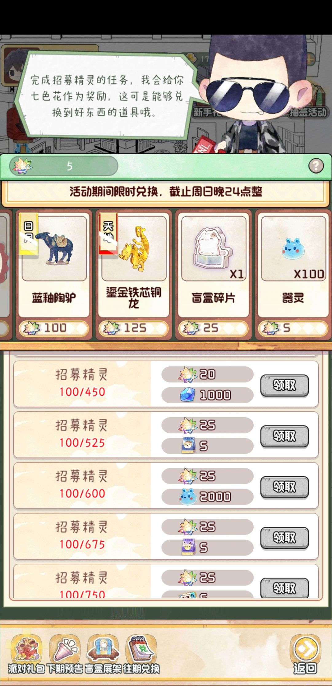 目前已知活动周每四周, 按照:精灵招募-招揽游客-精灵升级-器灵消耗 进行循环 一般来说我们可以提前囤积资源来获得尽量多的奖励, 但是我突然发现论坛上现有的活动周的截图,好像和现在的不太一样,应该是有更新过? 所以发一个帖记录一下四个活动周的奖励档位,以便于各位馆长按照需求来准备道具 一、精灵招募周: 一般来说,每周有3件文物可以兑换,需要消耗300个道具,也就是需要招募600个精灵,注意珍宝卷不