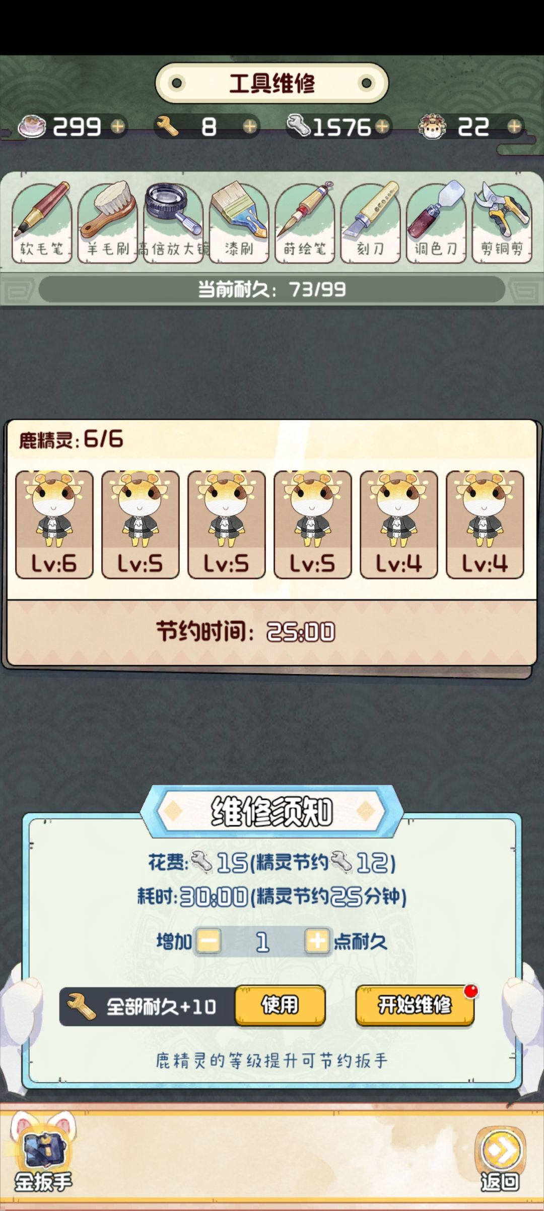 鹿精灵作用主要修复文物(碎片合成)和维修工具(回复耐久度),综合鹿还可以用于洞窟清理后格子的自动修复。 这里有一些鹿精灵等级和维修时消耗扳手机时间关系的猜测,希望和大家讨论和验证。 1.维修每回复1点耐久时,所需时间从第二个精灵每只会减少5min时间。初始30min,6只时5min。和精灵等级无关。 2.维修每回复1点耐久时,所需扳手数量和工作的6只精灵(等级最高的6只精灵)等级之和最高有关。等级