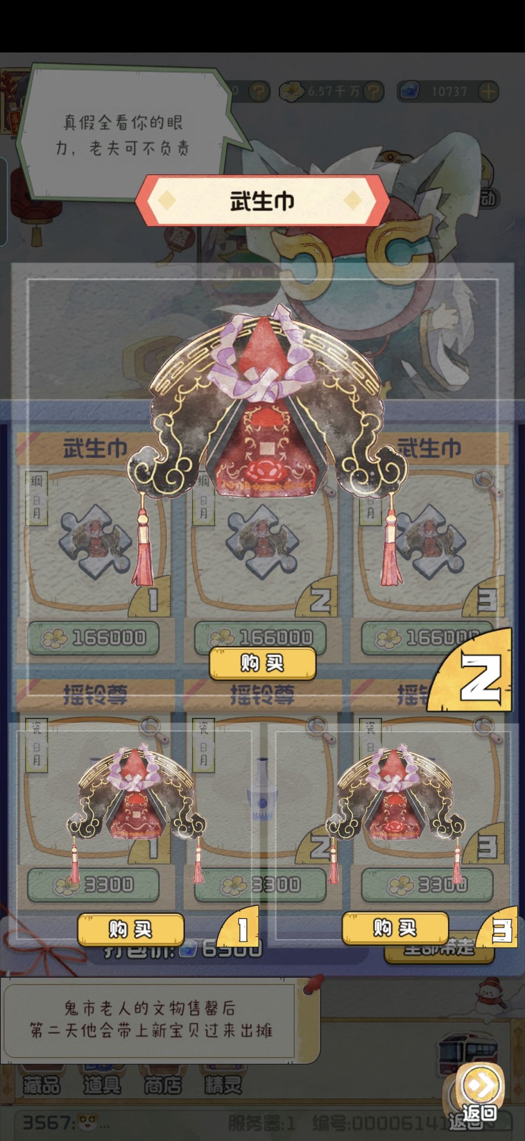 本期两个均适用于旧原则,但是图书馆里没有更新相关目录。 武生巾:真品中间有那个白色小方块,小方块下面还有那个红色的图案。像一朵云。 摇铃尊:真品既是锯齿纹又有那个大蓝圆点。#攻略#游戏攻略#新手攻略