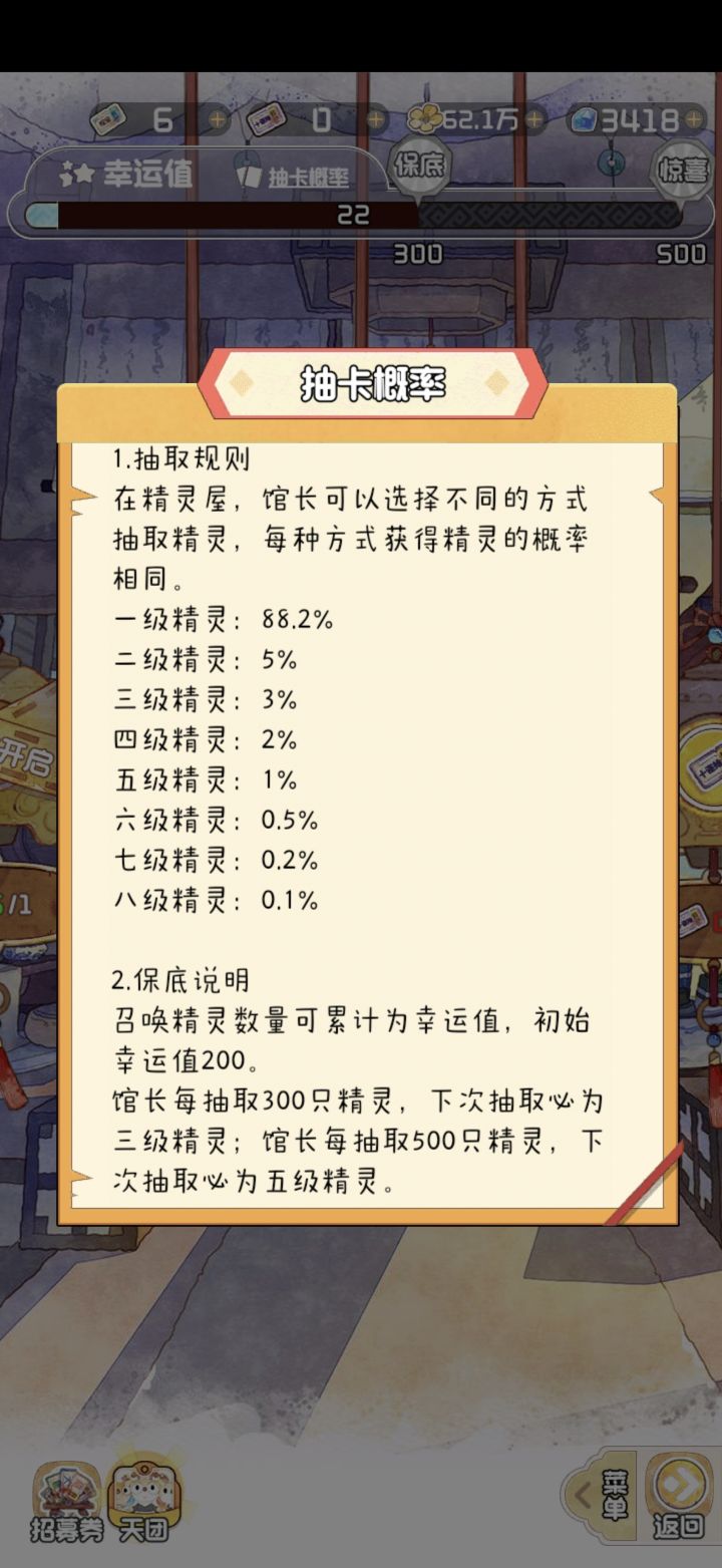 当前版本:2023.11.29精灵和抽卡系统也是游戏中比较重要的系统。下面整理了精灵养成和抽卡的部分攻略。抽卡抽卡分为十选三券(三种精灵),十连抽,和珍宝券。每日可以通过观看广告获得一张珍宝券。珍宝券只能在周末使用。珍宝券也是十选三,只是包含的奖励与纯精灵券不同。珍宝券只包含少量精灵,其他的是材料,猫(方便起见把所有粮我都叫猫粮了)粮,文物碎片,骨头等等杂物。珍宝券不计入任何活动次数、精