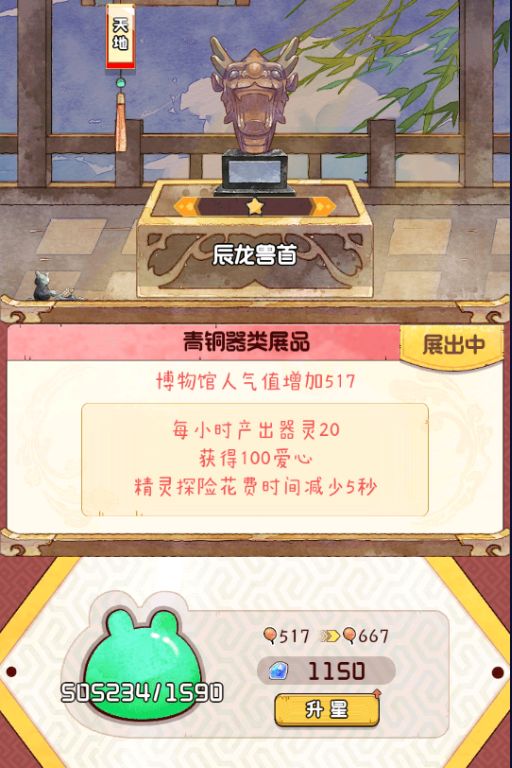 在游戏中,提升人气值的途径除了展出更多文物以外,也可以将已有的文物升星,每件文物初始为一星,最高可升至五星。 文物升星所需要的资源包括货币和器灵两种,消耗货币类型由文物的稀有度决定,其中草木、山川文物消耗花朵和器灵,日月、天地文物消耗钻石和器灵,星辰文物则部分消耗花朵和器灵,部分消耗钻石和器灵。 但将不同稀有度文物的升星消耗和人气值提升进行对比,可以看出稀有度越高的文物,升星越划算。如天地文物