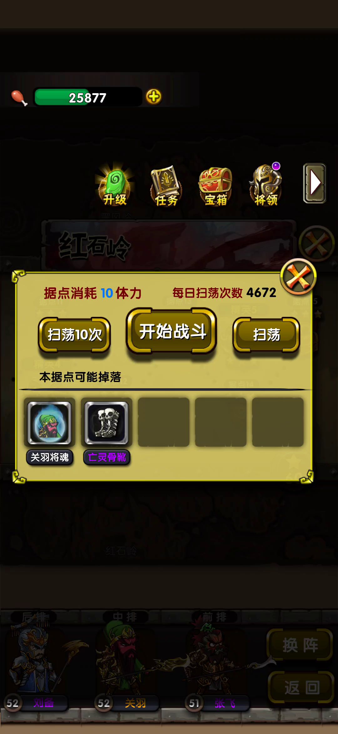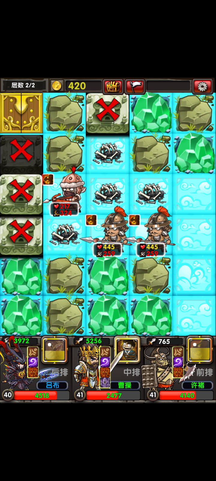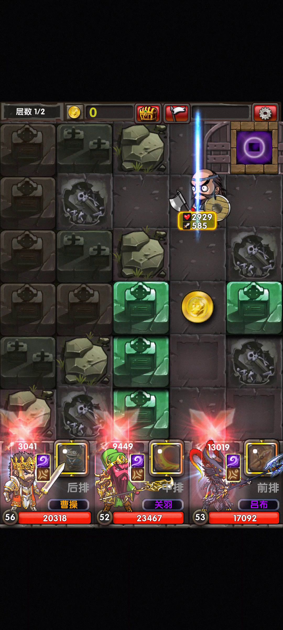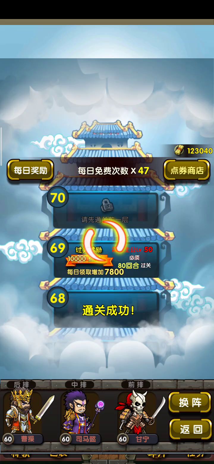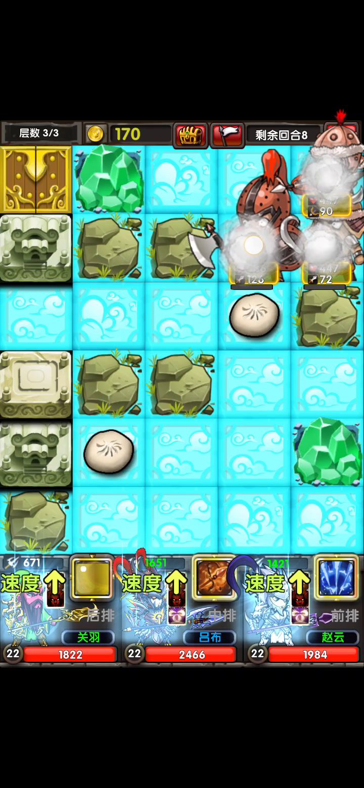 地图: 迷雾岛据点6 阵容:高攻武将就行,最好有一个攻击在9000以上,更快的秒怪。 小知识: 箱子不出货直接点白旗退出去,节省体力。