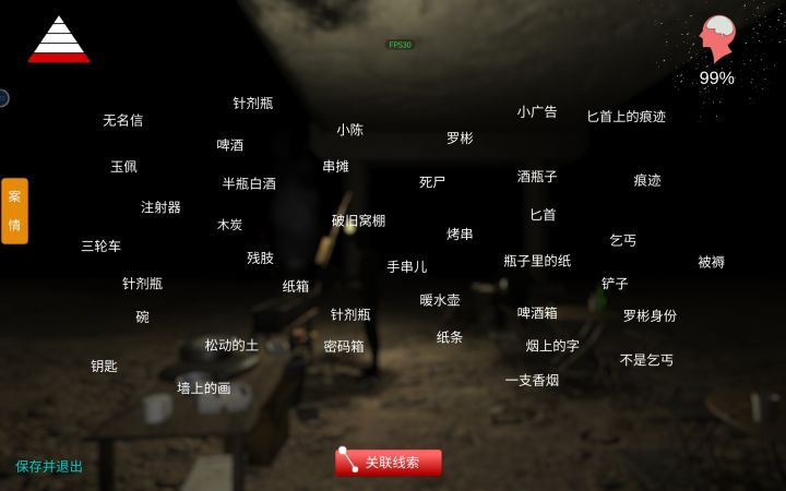 无高能。线索总览部分线索1.三个针剂瓶位置2.注射器3.密码箱(找到钥匙之后)左边上面0,下面3上面1,下面7右边上面0,下面6上面1,下面2弄完之后点中间的锁孔自动插入钥匙打开线索关联同样的对话可以多点几次,得到新线索之后重新对话可能会有新选项。1.乞丐+碗+死尸——不是乞丐2.纸箱+死尸+被褥——第二现场3.针剂瓶+针剂瓶+针剂瓶+注射器+痕迹——猜测4.玉