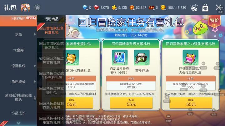 最好笑的是,其他的游戏在线一个小时是领垃圾道具。腾讯的冒险岛另辟蹊径,在线一个小时你将获得购买挂机礼包的权利,这属实绷不住。不知道得多有钱才能在这个游戏里消费。白嫖玩家的提升巨肝又巨慢,不充就要被卡级,例如50级有重要任务就要硬卡你49级一大段时间。在你有空的时间他让你自动寻路自动打怪让你双手离开屏幕只要掏钱就行;在你没空的时候就定时开BOSS让你下班又上班,怎么反人类怎么来。