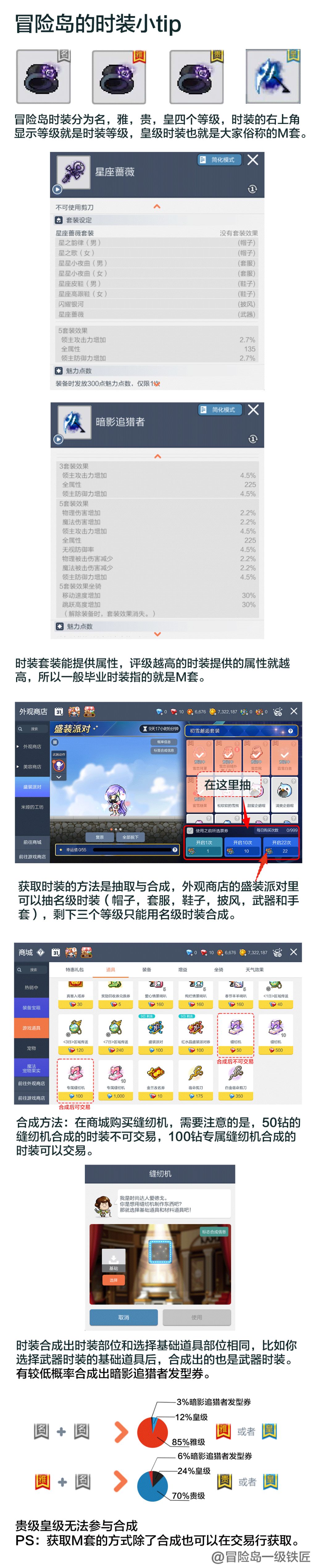 冒险岛时装分为名,雅,贵,皇四个等级,时装的左上角显示等级就是时装等级,皇级时装也就是大家俗称的M套。 时装套装能提供属性,评级越高的时装提供的属性就越高,所以一般毕业时装指的就是M套。 获取时装的方法是抽取与合成,外观商店的盛装派对里可以抽名级时装(帽子,套服,鞋子,披风,武器和手套),剩下三个等级只能用名级时装合成。 合成方法:在商城购买缝纫机,需要注意的是,50钻的缝纫机合成的时装不可交易,