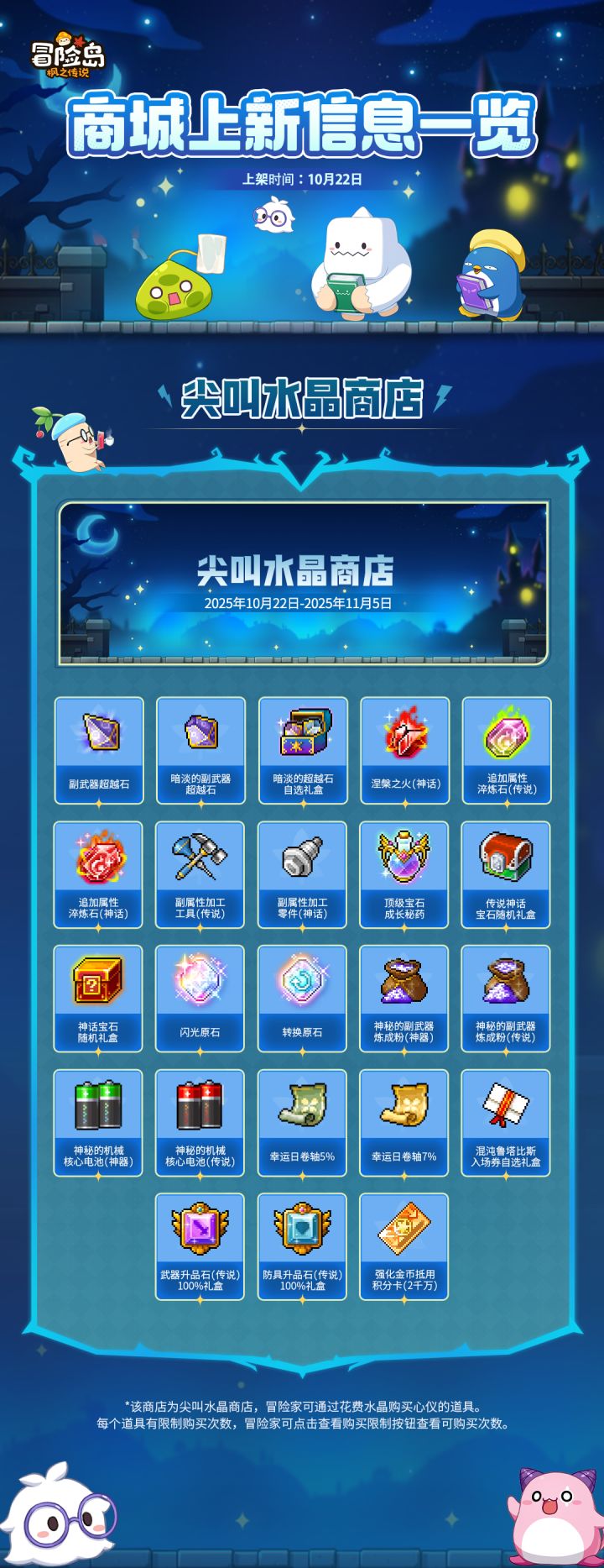 10月22日,为纪念新版本上线,商城推出尖叫水晶商店特别上新!本次尖叫水晶商店更新特别上架了超多实用道具特惠出售助力冒险家们角色提升,想要提高战力的冒险家们可以根据自己的需求到商城选购~更多超值道具也将同步上线,打开商城,冒险先人一步!#冒险岛手游 #冒险岛 #冒险岛枫之传说
