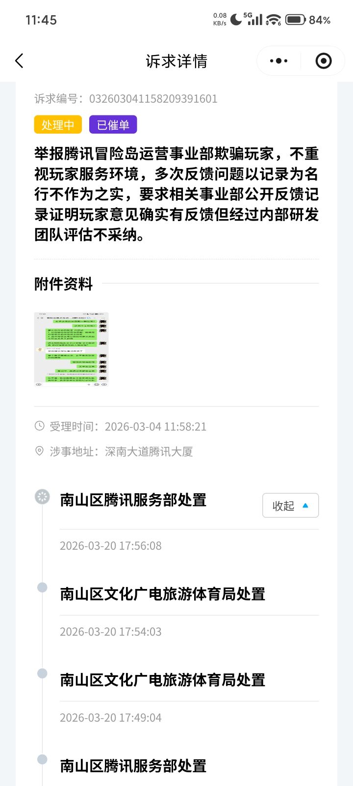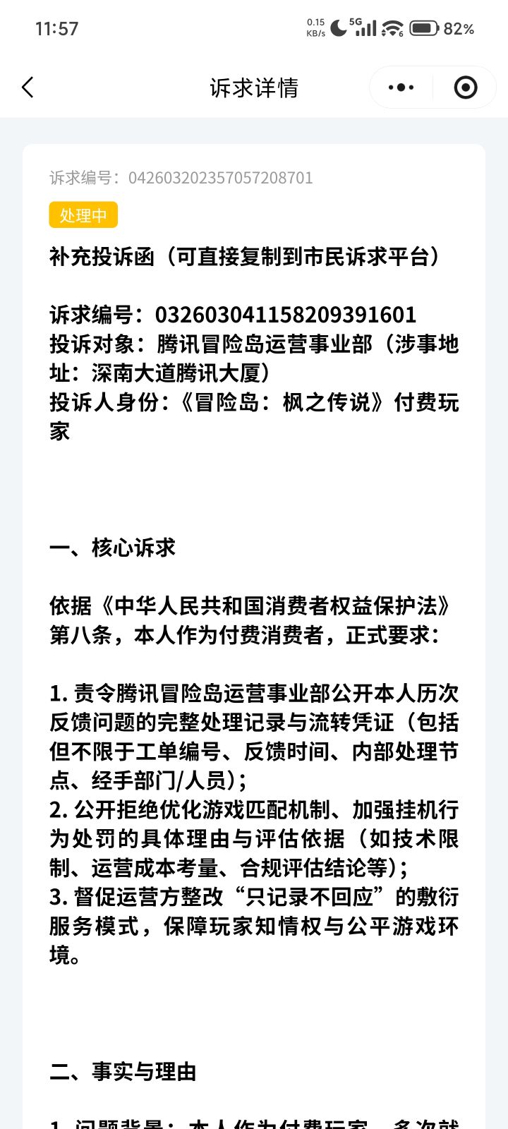 我是《冒险岛:枫之传说》付费玩家,长期投入金钱与时间,却遭遇严重不公:高分段频繁匹配挂机队友,游戏环境极度恶劣;举报挂机形同虚设,官方无有效处罚。我多次通过客服、官方群反馈问题,仅得到“已登记反馈”的敷衍回复,从未收到工单编号、处理记录与进展说明。 我已通过深圳市民诉求平台(编号:032603041158209391601)投诉,要求运营方公开反馈记录及拒绝理由,对方却直接拒绝且不给出任何合法