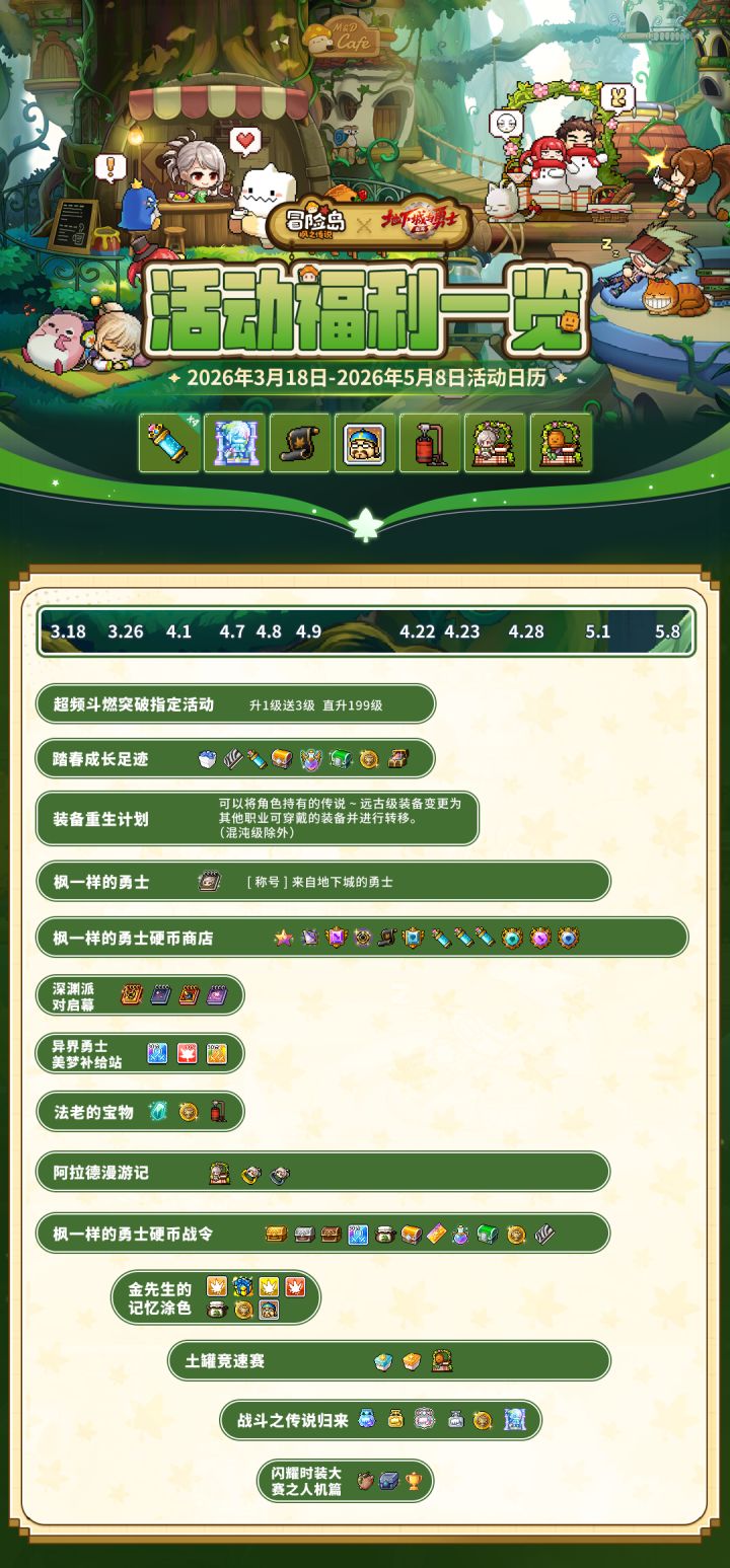 冒险岛手游xDNF手游联动版本来袭!超频斗燃突破指定活动升1送3直升199,踏春成长日记再加码挑战18天飞速升至200级!还有超多联动活动、联动外观同步上线!不想错过所有福利活动的冒险家,快来看小喵为大家准备的版本活动日历~#冒险岛手游 #冒险岛 #冒险岛枫之传说
