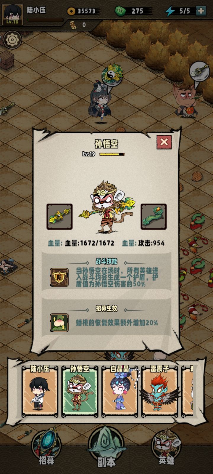 悟空到手,直接上第一主战,攻击高有护盾,升级快,然后刷4-2伯益,. 1-2南天门的杨戬,杨戬掉率是最低的一个。