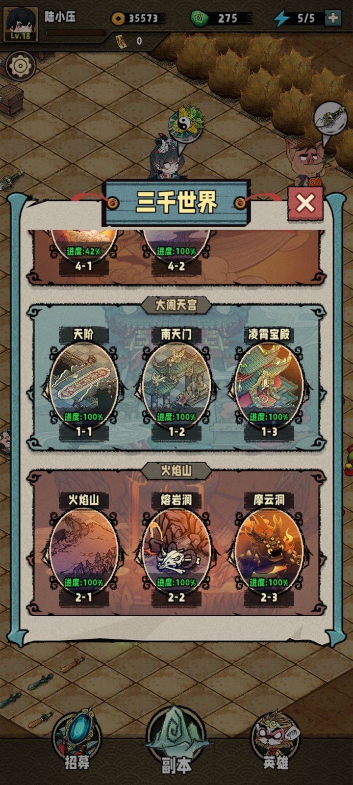 基本这个时候,悟空差不多13级,火焰山直接可以平推了,2-2熔岩洞目前不要刷,卡关会轮回,只有清除数据才能解决,直接刷2-3摩云洞,虽然此图卡关(进图就是击杀五个石头人的任务),但是,能进能退,多进几次就有一次可以刷,火堆里掉火德星君, 饕餮掉红孩儿,铁扇公主期待后续剧情完善。