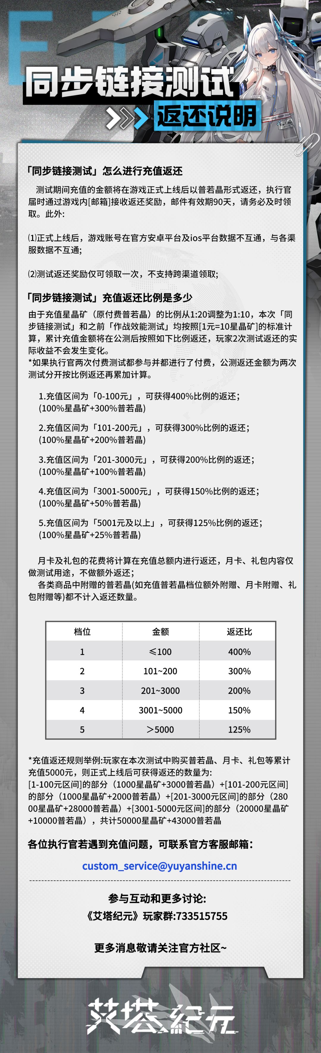 本次「同步链接测试」为安卓限时删档付费测试,测试期间充值金额将按照以下《同步链接测试返利说明》的规则在公测时进行返还!还请执行官仔细查阅,第九协约等待执行官的到来! ✦ 测试时间:2023/11/24-2023/12/8 ▲官方Q群▲ 玩家交流群:733515755 ▲前往预约▲ ▲了解更多▲ 官方微博:艾塔纪元 官方公众号:艾塔纪元 官方抖音:艾塔纪元 官方视频号:艾塔纪元#游戏推荐#游戏资讯#国产游戏