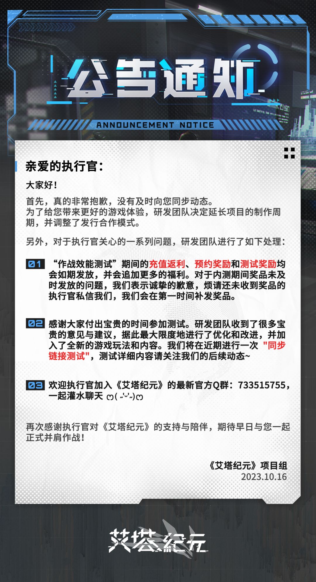 亲爱的执行官: 首先,真的非常抱歉,没有及时向您同步动态。 为了给您带来更好的游戏体验,研发团队决定延长项目的制作周期,并调整了发行合作模式。 另外,对于执行官关心的一系列问题,研发团队进行了如下处理,再次感谢执行官对《艾塔纪元》的支持与陪伴,期待早日与您一起正式并肩作战!#游戏资讯#国产游戏#二次元